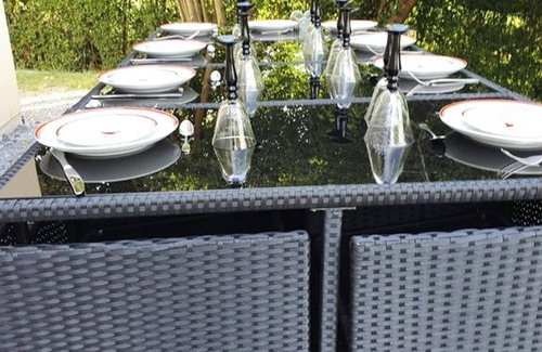 La casa cuenta con una encantadora terraza donde puedes disfrutar de las comidas al aire libre con vista al jardín privado cercado. El jardín incluye un columpio para los más pequeños y una barbacoa para noches de parrillada. Hay aparcamiento disponible en el lugar, facilitando las entradas y salidas.