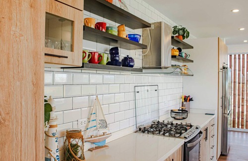 La cocina está equipada con horno, placa de cocina y frigorífico, además de cafetera y tetera, microondas y utensilios de cocina. Y como hay acceso a una lavandería, no necesitarás llevarte mucho equipaje. Otras comodidades incluyen ropa de cama y una tabla de planchar.
