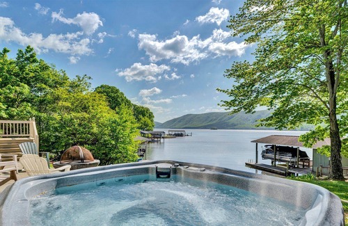 Esta casa de 3 dormitorios y 2 baños ofrece un diseño abierto con vistas al lago y a la montaña. La sala de estar cuenta con cómodos asientos, TV de pantalla plana y vistas espectaculares al lago y a la montaña Smith. El dormitorio principal ofrece una cama king con baño privado. Un segundo dormitorio con una cama queen y un tercer dormitorio con 2 gemelos comparten un baño grande. Una cocina abierta completamente equipada con una barra de desayuno, perfecta para disfrutar de su té o café por la mañana (incluido por goteo y Keurig) y el área de comedor con una mesa rústica de la casa de campo son excelentes para comer. Un gran porche cubierto con mecedoras acolchadas le permite disfrutar de las vistas en cualquier clima. Hay muchas comodidades, con 2 kayaks, una bañera de hidromasaje y una hoguera para que los huéspedes disfruten. Esta casa es la escapada perfecta al lago. Esta casa tiene vistas inigualables y un maravilloso muelle junto con el interior maravillosamente decorado, el solárium y el diseño abierto hacen que esta sea la mejor escapada. Esta será una casa a la que querrá regresar año tras año.