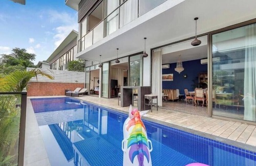 Comfortable Amenities: Guests enjoy private check-in and check-out services, housekeeping, an indoor and outdoor play area, and free on-site parking. Additional facilities include air-conditioning, a private pool, and a balcony with garden views.