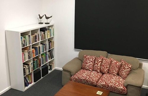 El salón tiene un televisor de pantalla plana de 55 "y una biblioteca de libros para su disfrute.