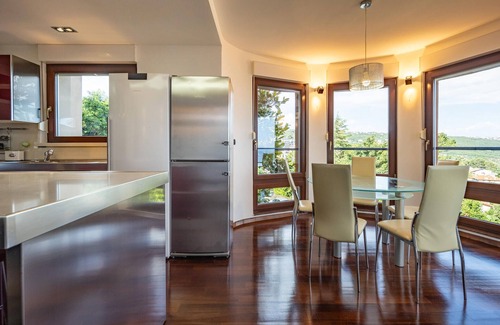 Pase unas vacaciones de lujo en su apartamento de vacaciones, que se encuentra en una ubicación privilegiada en Opatija. El mobiliario elegante y de alta calidad confiere al piso un ambiente muy especial que garantiza una atmósfera de bienestar absoluta. Relájese en el amplio salón y disfrute de las impresionantes vistas de la bahía de Kvarner y las islas de Krk y Cres, tanto desde el balcón como desde el interior. Comience el día con un acogedor desayuno mientras contempla el resplandeciente mar que se extiende ante usted.