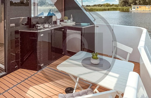 La casa flotante está totalmente equipada con aseo (inodoro eléctrico), lavabo, ducha independiente, cocina con fregadero, dos fogones de gas y nevera, zona de estar, armario empotrado y TV. Gracias a su acristalamiento integral, podrá disfrutar de unas vistas impresionantes del agua y el paisaje desde cualquier punto de la casa flotante. Lo más destacado de la casa flotante le espera en la zona exterior: la terraza de popa está equipada con una moderna cocina exterior con nevera, fogones y fregadero, para que pueda cocinar y comer al aire libre cuando haga buen tiempo. Desde la popa de la casa flotante, una escalera exterior conduce a la azotea, donde una maravillosa terraza se extiende por toda la zona habitable.