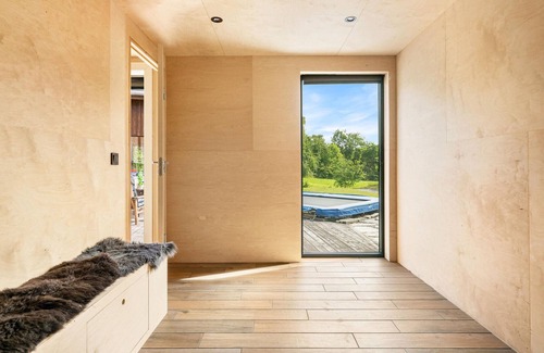 Pase unos días relajantes en un entorno natural, ideal para familias que desean combinar naturaleza, comodidad y actividades. Esta casa de madera diseñada con buen gusto ofrece las condiciones ideales para unas vacaciones satisfactorias junto al fiordo. Disfrute del amplio salón con techos altos, mucha madera y grandes ventanales que ofrecen vistas al campo. Ponte cómodo en la zona de sofás o pon la mesa de comedor para comer todos juntos. Cocina en la moderna cocina, donde varias personas pueden cocinar juntas cómodamente. El diseño de planta abierta invita a pasar horas de relax en un ambiente acogedor.