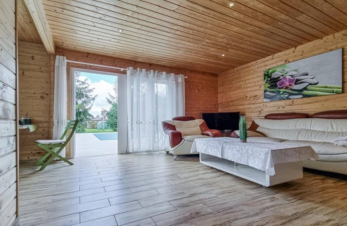 Acogedora casa de madera con amplios terrenos y piscina privada al aire libre.