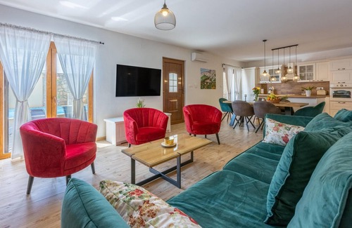 Moderna casa de vacaciones con piscina y vistas al mar en Grizane.