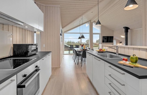 Esta bonita casa de vacaciones tiene una cocina abierta que da al comedor y al salón con estufa de leña. La acogedora casa tiene 3 dormitorios y una alcoba en el salón y 2 cuartos de baño, ambos con ducha. Desde el salón se accede a la terraza abierta y cubierta. Si hace demasiado calor en verano, puede refrescarse bajo la ducha exterior en el jardín.