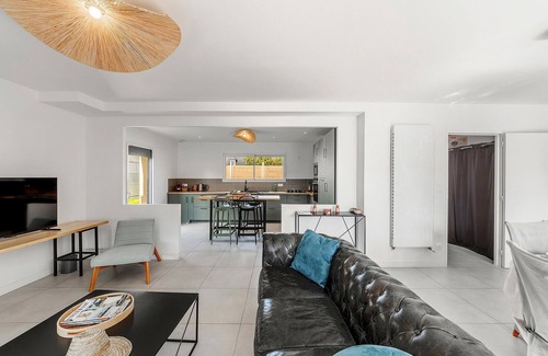 Alójese en esta moderna casa con una preciosa terraza de madera y un gran jardín, ¡ideal para pasar horas de relax cerca del mar!