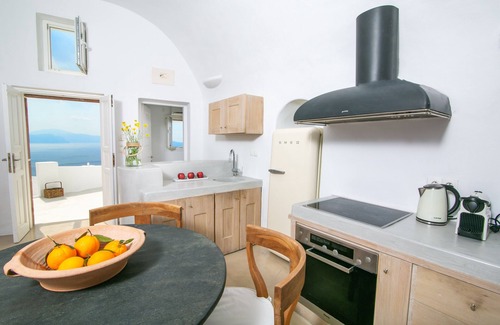 De Menia Cave House ofrece la verdadera experiencia de la isla griega, ya sea que estén en la cocina o en uno u otro dormitorio tiene la mejor vista a la caldera. Lo que da a la villa un privilegio único.