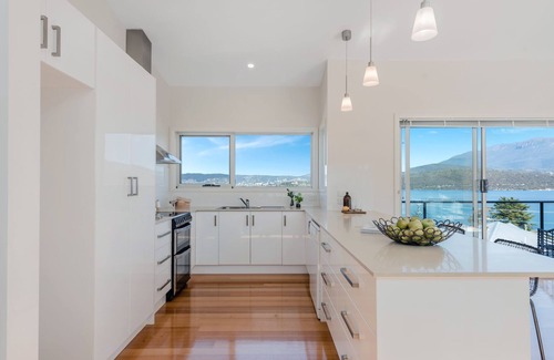 "Deep Blue" no solo cuenta con una ubicación espectacular: es su hogar lejos del hogar de Hobart, brindando un alto nivel de estilo y comodidad, haciendo que su estadía aquí sea placentera. La casa cuenta con una vida de planta abierta en su máxima expresión, con un amplio espacio de vida, cocina y comedor que fluye a las cubiertas y permite que la vida interior se derrame al aire libre. Las ventanas en cada esquina enmarcan las magníficas vistas panorámicas, proporcionándole su propia galería de arte viva.