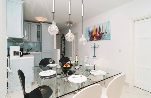 Este moderno apartamento de vacaciones goza de una ubicación privilegiada en la ciudad de Split, a pocos pasos del mar y de la hermosa playa de guijarros de Njan. Además del confortable mobiliario, la terraza ofrece una excelente vista del mar y de las islas circundantes. El hermoso paseo marítimo, las tiendas, los restaurantes y los chiringuitos son otras de las comodidades de esta zona que harán que sus vacaciones sean completas. Aparque su coche en el garaje, ya que podrá llegar fácilmente a pie al centro de la ciudad y a sus lugares de interés.