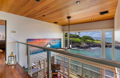 casa frente al mar contemporáneo en Napili. Esta casa de 2 dormitorios es todo acerca de la calidad de los acabados de la técnica, lo tiene todo. El piso de ventanales tienen vistas a las aguas azules de una cala privada en Napili. Vistas de Molokai en la distancia con ballenas pasando por todo el día, durante la temporada de ballenas. La cala es el hogar de muchas tortugas, ya que es una cueva de anidación por debajo de la casa. Las tortugas pueden ser vistos mientras se está sentado en la casa, que rodea las cubiertas. o nadar con ellos ya que la playa está a pocos pasos de distancia.