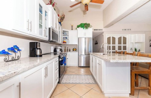 La cocina grande está completamente equipada con todos los electrodomésticos, como refrigerador, horno, microondas, lavavajillas, licuadora, tostadora y cafetera.