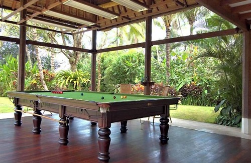 La fiesta de invitados puede entretenerse en el salón principal, ver pabellones, patios de jardín o terrazas de barbacoa. Al mismo tiempo, los miembros del grupo tienen la libertad de relajarse en privado en camas de día y terrazas. Los niños tienden a gravitar hacia la sala de cine para las Playstations de pantalla grande, pero pueden ser engañados afuera para otros entretenimientos. La gran piscina que centra la Villa es aislada, privada y el punto focal para la relajación. Snooker, Pool y Caroom son particularmente populares durante el día y la sala de billar abierta está convenientemente ubicada tanto en la piscina como en el punto de recarga para refrescos. El tenis se juega mejor por la mañana, por la tarde y por la noche con un entrenador profesional disponible con cita previa. El Yoga es cada vez más popular y los pabellones de vista son particularmente adecuados para esto. Bali ha atraído a muchos entrenadores excelentes, particularmente en el área de Ubud, y se pueden organizar sesiones tanto para Astanga como para Yoga clásico. La villa mantiene un buen suministro de colchonetas.