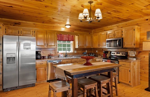 The Black Bear Lodge ofrece lujo e innumerables comodidades. Al aire libre, puede sumergirse en la bañera de hidromasaje privada bajo el cielo nocturno, relajarse alrededor de la hoguera de piedra, asar en la parrilla de propano Weber o simplemente tomar un café en los porches o en el patio del nivel inferior. En el interior, el Black Bear Lodge ofrece dos niveles de espacio, mucho espacio para todos y al mismo tiempo conserva su personalidad romántica y lujosa. Esta casa meticulosamente mantenida ofrece una hermosa construcción interior de pino, una cocina gourmet con una mesa de comedor hecha a medida, una acogedora sala de estar en el piso superior con TV de pantalla plana y chimenea de piedra natural, una habitación familiar súper acogedora de nivel inferior con TV de pantalla plana, 3 habitaciones equipadas con sábanas de algodón egipcio súper acogedoras, 3 baños completos, WiFi de alta velocidad e incluso juegos, libros y rompecabezas para disfrutar. ¡Los huéspedes solo deben traer su ropa, artículos de tocador y comestibles ya que los propietarios han pensado en todo lo demás para usted! ¡Ven a relajarte y disfruta de las montañas!