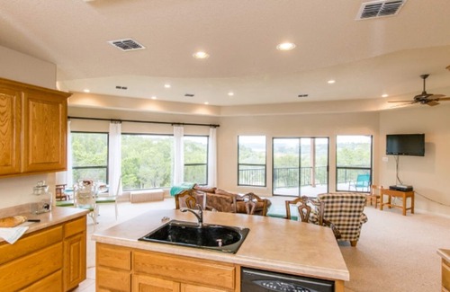 Bienvenido a "Ten Brink House", una excepcional casa de alquiler vacacional en Village West en Canyon Lake, Texas. Nuestra casa, ahora su casa, es nueva, hermosa e impecable con un plano de planta abierto y acogedor. Grandes ventanas enmarcan las vistas de Texas Hill Country y Canyon Lake. Las vistas del lago se ven desde el dormitorio principal, el segundo dormitorio, la sala de estar, la cocina, el comedor y el patio.