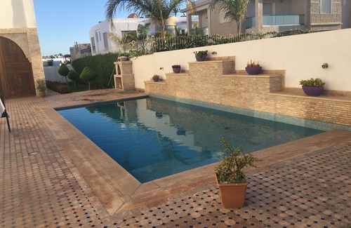 Esta maravillosa villa con piscina se encuentra en una zona muy segura y está a solo unos pasos de la playa de arena dorada de Agadir. Esta encantadora villa es un suburbio muy tranquilo y frondoso con excelentes conexiones de transporte. Es perfecto para viajar por Agadir, ya que está a pocos pasos de la vida nocturna y la playa, y también tiene una bonita piscina.