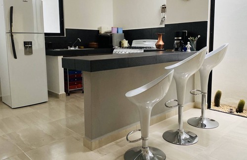 Es una amplia Casa para, en fraccionamiento con seguridad 24 hrs, con excelente ubicación, Alberca Privada, bonito jardín, gran asador, 3 recámaras con AC y persianas blackout, cada una con su baño completo, sofá cama, cocina equipada, gran comedor, sala, excelente vajilla para celebrar las fiestas decembrinas, WiFi, TV 50” con Netflix, bocinas, ventiladores y aires acondicionados, garaje exterior para dos autos y todo lo necesario para disfrutar de tu estancia con capacidad hasta para 10 huéspedes.
