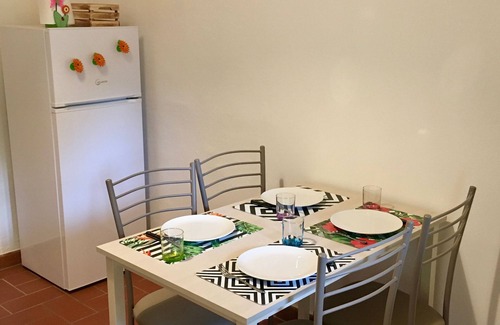 Desde la cocina hay acceso a un pequeño patio y jardín, a disposición de los huéspedes: el lugar ideal para relajarse después de un día descubriendo la Toscana o para almorzar o cenar al aire libre, al abrigo del pequeño porche o en la sombra de los árboles para estar fruto.