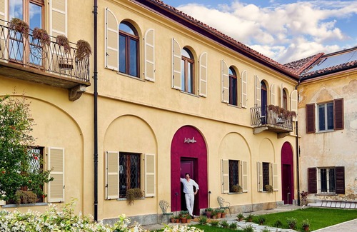Salone di Bruno, the shared living room, invites guests to relax amidst vaulted ceilings, contemporary art, comfy seating, antique furnishings, and a grand fireplace. French doors open onto Il Giardino di Anna, a tranquil shaded garden perfect for unwinding with a book or a glass of wine.