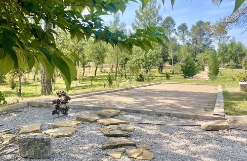 Presencia de una barbacoa de plancha de gas, cocina de verano equipada, grandes y cómodos sillones, 8 tumbonas, gran pista de petanca.