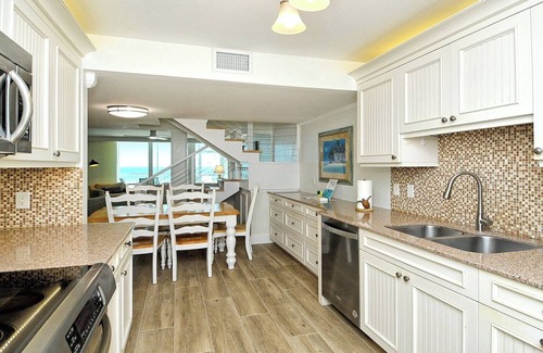 Esta espaciosa unidad es luminosa y fresca con una nueva decoración y baños y cocinas totalmente renovados con granito y azulejos relucientes. El plano de planta abierto ofrece vistas panorámicas de la playa y el golfo desde la cocina hasta la sala de estar y el comedor, y al porche privado y los escalones que conducen a la playa. Todas las habitaciones están alfombradas. El dormitorio principal en el segundo nivel tiene ventanas de piso a techo y controles deslizantes a una terraza con vista a la playa.