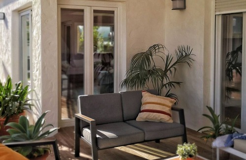 La sala de estar se abre hacia el exterior sobre una gran terraza cubierta parcialmente y el área de la piscina detrás. En el rincón más alejado de la piscina se ha construido un anexo con dos dormitorios individuales y un aseo con ducha e inodoro. En dos de los lados de la piscina se yerguen las majestuosas palmeras que le dan su nombre, y el otro lado está cubierto por un extenso césped, ideal para grupos con niños. Como extra la casa también dispone de una valla opcional para separar este área de la piscina. Este lado de la casa recibe luz solar durante todo el día hasta bien entrada la tarde. Para disfrutar de las últimas horas de sol podremos trasladarnos a la otra terraza junto a la puerta principal, rematada con un par de olivos centenarios. El techo del anexo está cubierto por paneles fotovolaicos que permiten a Las Palmeras generar y exportar a la red mas energia (libre de carbono) que consume.