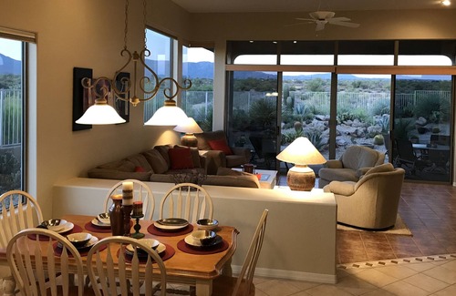 Relájese en esta cómoda y espaciosa casa de concepto abierto de 2 dormitorios y 2 baños en una tranquila calle sin salida en Legend Trail. Esta hermosa casa cuenta con increíbles vistas, con pisos cerámicos en la sala de estar principal acompañada de techos de 12 pies. Despiértese con increíbles amaneceres y vea espectaculares puestas de sol en el patio cubierto o desde la comodidad de la gran sala de estar. El patio trasero muy bien ajardinado y muy privado limita con el espacio abierto de la reserva estatal y tiene vistas despejadas al desierto y a la montaña.