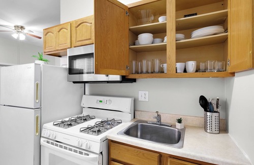 The kitchen is fully equipped with microwave, oven, stovetop, coffee maker, toaster, full dishware, flatware, and cookware. Everything you need to make a comfortable stay yours.
