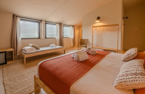 En la segunda planta encontramos la zona de las habitaciones: 2 suites de matrimonio con bañera y 5 triples con ducha (una de ellas adaptada para silla de ruedas y tres de ellas con vistas al valle. Todas las habitaciones disponen de bomba de frío/calor).
