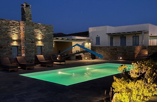 La propiedad se encuentra en el paseo marítimo, con acceso al mar, en la zona de Akrtotiri - Otzia, a 10 minutos del puerto de la isla y a una hora y media del aeropuerto. La villa se encuentra en una parcela de 8,000 metros cuadrados con el mar que la rodea por dos lados, en una ubicación muy tranquila y privada, pero con fácil acceso a restaurantes y tiendas. Alrededor de la villa hay grandes terrazas, todas con fantásticas vistas al mar, así como una terraza muy grande con una piscina de agua de mar al lado de la villa, donde uno puede relajarse en una de las hamacas con una copa de vino mientras disfruta del vista al mar, así como las increíbles puestas de sol. Cerca de la piscina hay una gran área sombreada con una zona de estar y comedor, que conduce directamente a la villa.