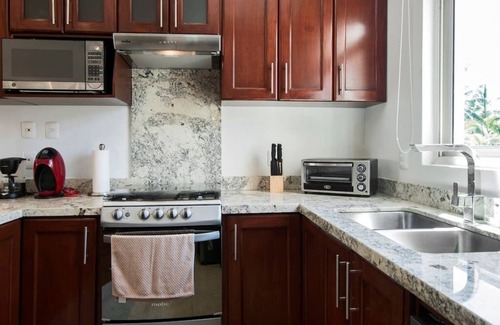 The unit is on the 2nd floor, with access to an elevator, no more than 10 steps away from the doorstep and an emergency staircase just outside. One parking space (elevator access to the condo), It is a 1 bedroom, 2 complete bathrooms, wireless service, air conditioning, living area with one 52´Smart TV screen with Netflix and Shaw TV and 1 32" Smart TV for Netflix in the bedroom. A balcony with a great BBQ to entertain friends. Has a washer/dryer . A fully equipped kitchen, dishes and utensils, toaster, microwave, coffee maker, oven, dishwasher and kitchen waste disposer. Also towels and linens as well as a iron and board; the housekeeping is optional and we can arrange that as many times as you need it, the fee is 300 pesos per service.