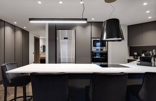 As you enter this newly renovated and sophisticated apartment, you'll be greeted by a bright, open-plan living room featuring a comfortable corner sofa, a modern fireplace, and a dining area with a wonderful round dining table. Adjacent to this open space is the fully equipped kitchen, complete with all necessary amenities, storage cabinets, and a sleek white breakfast counter. The interiors are tastefully decorated in dark grey tones with a dark marble tiled floor, creating a chic and contemporary ambiance.