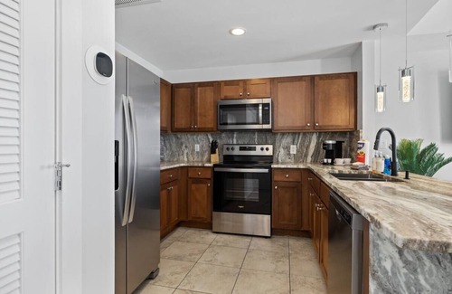 Este alojamiento de 1 dormitorio y 1 baño cuenta con una sala de estar, un comedor, una zona para barbacoas y aire acondicionado. El cuarto de baño incluye un secador de pelo, toallas y papel higiénico. Prepara una comida casera en la cocina, equipada con horno, placa de cocina y frigorífico, además de cafetera y tetera, máquina de hielo y microondas. Y gracias a la lavadora y la secadora, podrás viajar con poco equipaje.