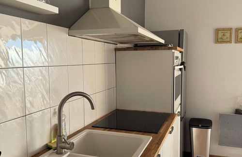 La cocina americana está muy bien equipada, nevera-congelador, lavavajillas, horno de pirólisis, microondas, lavadora 6 kg, gracias a su doble encimera, le permite tomar un aperitivo o un desayuno en un ambiente agradable.