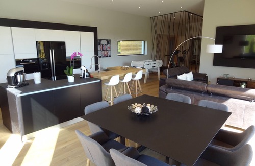 La villa está organizada en torno a una gran sala, favoreciendo el espacio y los hermosos volúmenes. Los ventanales de gran tamaño ofrecen una vista panorámica del campo y la piscina de 14 metros de largo, rodeada por la espaciosa terraza. Por lo tanto, por sus grandes dimensiones, esta sala de estar alta y luminosa invita a sus huéspedes a relajarse con cordialidad, volumen y comodidad.