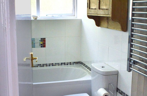The bathroom has a bath with overhead shower (plenty of hot water provided by a timer controlled immersion heater), mosaic details and tongue and groove painted ceiling and panelling contrasting with the light, white tiles.