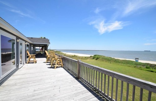 Hermosa casa ubicada en la punta de la península de Bolívar. Siéntese en la sala de estar o cubierta y disfrute viendo los barcos que pasan en la noche. Playa tranquila ofrece majestuoso amanecer y puestas de sol. Esta área es un paraíso para los amantes de las aves. No te cansarás de ver las numerosas especies de aves justo en frente de la casa o ir a pescar a los cercanos North Jetties. Con todos los electrodomésticos modernos, incluyendo calefacción central / aire, losa, alfombra parcial, microondas, lavavajillas, videograbadora, TV por satélite, DVD, lavadora / secadora, esta casa lo tiene todo. 3 de las habitaciones tienen camas King size y el cuarto dormitorio tiene 2 reinas. No fumar y tarifa por mascota (mascota pequeña, sin gatos). Se encuentra al lado del histórico parque Fort Travis, donde puede disfrutar del sendero natural y explorar el parque. El compañero de casa es Cottage on the Cove, ubicado al lado. Ropa de cama disponible por un costo adicional a pedido. La playa es estrecha en este lugar.