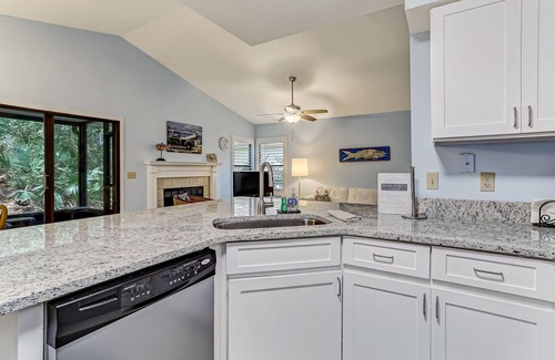 Al entrar por la puerta principal y al gran salón, se sentirá como en casa con la paleta de colores costeros de hermosos azules y neutros suaves que ofrece esta casa. ¡Esta casa decorada con buen gusto, con sus muebles costeros, sus hermosas persianas de plantación blancas y su arte y accesorios de pared con tema de playa, le brinda inmediatamente esa sensación de estar en el mar! La gran sala cuenta con techos abovedados, pisos lavados de color gris claro, una lujosa sección de funda de funda blanca y un televisor de pantalla plana. La cocina equipada con electrodomésticos de acero inoxidable, taburete de bar y una mesa para 6 da a la gran sala. A través de los deslizadores de vidrio que se encuentran fuera de la cocina, se ubica la galería con un cómodo sofá de mimbre y sillas perfectas para descansar y sumergirse en una buena lectura.