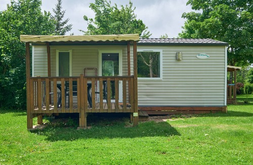 Esta casa móvil cuenta con una terraza cubierta privada. Además, los huéspedes tienen acceso a instalaciones al aire libre compartidas: una gran piscina compartida supervisada y accesible de forma gratuita, pistas de voleibol y petanca, un parque infantil, barbacoas y un bar.