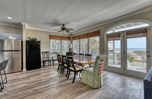 Moonlighting is an eight-bedroom, eight-bath beach home located in Long Bay Estates between Myrtle Beach and Surfside Beach, and across the street from beach. This home features two fully-equipped kitchens complete with two large refrigerators, ice makers, microwaves and dishwashers, as well as two washer and dryers, central heat and air conditioning, hardwood floors, and ceiling fans. Flat screen TVs (cable), stereo with CD player, and Wi-Fi are also provided. Sleeping accommodations include one king, eight queen, and three twin-sized beds, plus two queen sofa beds. A highchair is available for infants or toddlers. The large backyard has a private 30-by-15-foot swimming pool with large oceanfront decks and easy beach access. Other outdoor amenities include a shower with hot and cold running water and two grills. No smoking. No pets. Maximum occupancy: 25