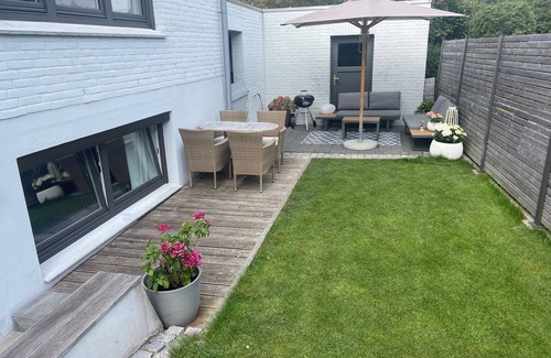 Unos pocos pasos conducen a una entrada independiente al apartamento en el sótano de una casa unifamiliar a solo 50 metros de la playa de arena.