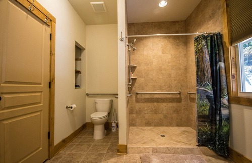 Algo de lo que estamos muy orgullosos: Eagle's Nest fue construido pensando en las personas con discapacidad. Desde el pórtico delantero hasta las puertas más anchas y las duchas / lavabos de entrada baja, hicimos nuestro mejor esfuerzo para acomodar sillas de ruedas. Es posible que la casa no sea perfecta para todas las personas discapacitadas, pregúntenos si no está seguro, pero se consideró con mucha anticipación y se incorporó al diseño.