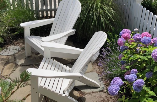 Adirondack sillas en el patio delantero ajardinado para el café de la mañana. El patio privado del patio trasero cuenta con parrilla de gas, mesa de picnic con sombra y luces de cuerda para las reuniones nocturnas.