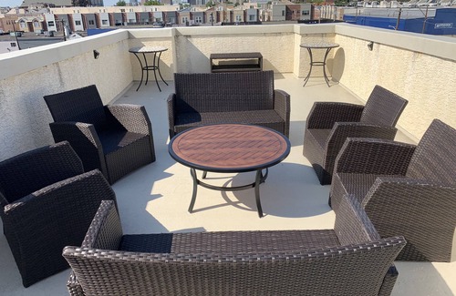 Por último, pero no menos importante, es tu camino a la cubierta superior del techo. Aquí podrá sentarse y disfrutar de la vista de la ciudad. Hay cómodos asientos al aire libre para 8 personas y no se preocupe, ya que hay un refrigerador y un fregadero ubicados en este nivel.