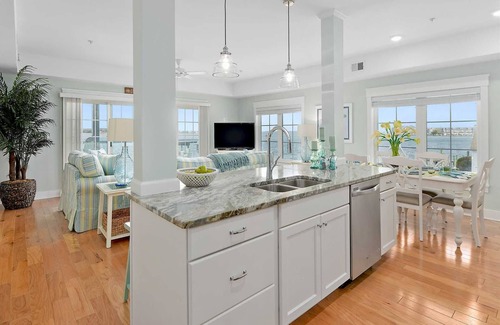 El plano abierto incluye una cómoda sala de estar con muchas ventanas y una puerta corrediza de vidrio que da al balcón con vistas despejadas a la bahía. Relájate y relájate en los nuevos y cómodos sofás o en los muebles de lujo del balcón adirondack para ver todos los barcos en la bahía. La sala de estar tiene un televisor Smart HD equipado con servicio de cable HD. Directamente detrás de la sala de estar, hay una mesa de comedor con seis sillas y una magnífica barra de desayuno con cuatro taburetes. Juegue, planee sus días o disfrute de comidas preparadas o caseras preparadas en la hermosa cocina. La cocina brillante y bien equipada ofrece una gran cantidad de accesorios, utensilios y utensilios de cocina, así como nuevos electrodomésticos de acero inoxidable y mostradores de granito. La suite principal tiene una lujosa cama king-size, acceso al balcón privado y un baño completo en suite. La primera habitación tiene una cama queen y baño, la segunda tiene una cama queen y camas dobles, y la tercera habitación tiene una cama litera doble con una cama nido extraíble, lo que la hace ideal para los niños. Además, hay un sofá cama doble en la sala de estar. Esta casa tiene capacidad para 15 invitados (12 adultos) y es ideal para una gran reunión familiar o algunas parejas que visitan la costa juntos. El acceso WiFi gratuito está disponible con televisores inteligentes equipados con cable en cada habitación. La unidad incluye lavadora / secadora, para hacer un trabajo rápido de las necesidades de lavandería.