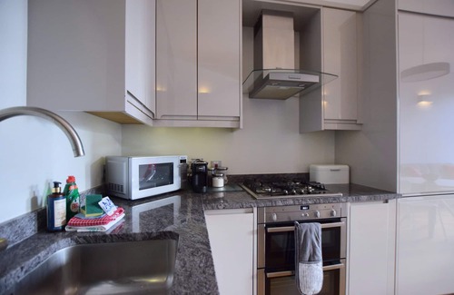 La cocina moderna equipada en gris oscuro con las tapas de granito gris tiene una cocina de gas de 4 fuegos, 2 pequeños hornos eléctricos, microondas, nevera y congelador independiente, pequeño lavavajillas y una cafetera Lavazza mio. Una pequeña isla central tiene utensilios de un lado y armarios con libros, juegos y DVD en el lado del comedor. El comedor tiene una pequeña mesa redonda y 4 sillas contemporáneas. En el salón hay un sofá grande gris (que se convierte en un sofá cama) para 2 con 2 sillas de bañera rojos zingy, un televisor montado en la pared con DVD y una radio de diente azul. Dos grandes ventanales dan a una plaza de bonitos jardines y terrazas georgianas.