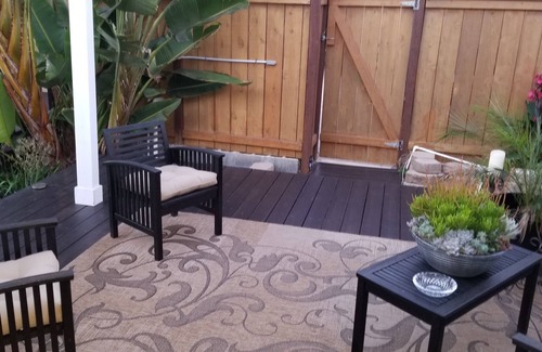 La casa de huéspedes se encuentra detrás de la casa principal. Disfrutará de esta casa de 1 habitación y 1 baño de 370 pies cuadrados junto con una gran terraza al aire libre con los mismos pies cuadrados que la casa de huéspedes. Ingresará a través de una puerta privada que lo llevará a un patio tropical recientemente ajardinado que puede usar. Vivimos en la casa principal con una terraza más grande y un patio. Este es nuestro espacio privado y estará fuera del alcance de los huéspedes de nuestra casa.
