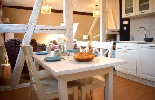 El acogedor dúplex de Obernai es un apartamento independiente situado en el último piso de una casa de pueblo alsaciana con entramado de madera sin ascensor.