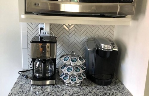 - Cocina equipada con: 1 rollos de toallas de papel, detergente / lavavajillas, lavavajillas con vainas de detergente, sal / pimienta, aceite en aerosol, variedad de especias, azúcar, Keurig con 1 vaina por huésped por día, cafetera normal con filtros, filtrada agua de nevera, cocina completamente equipada.